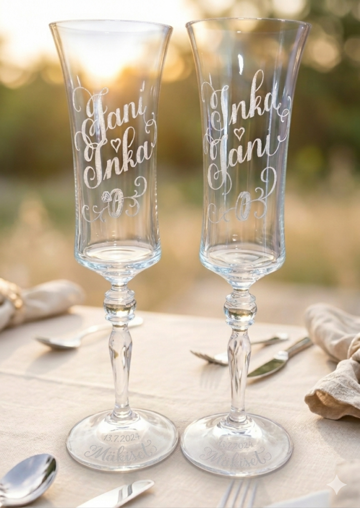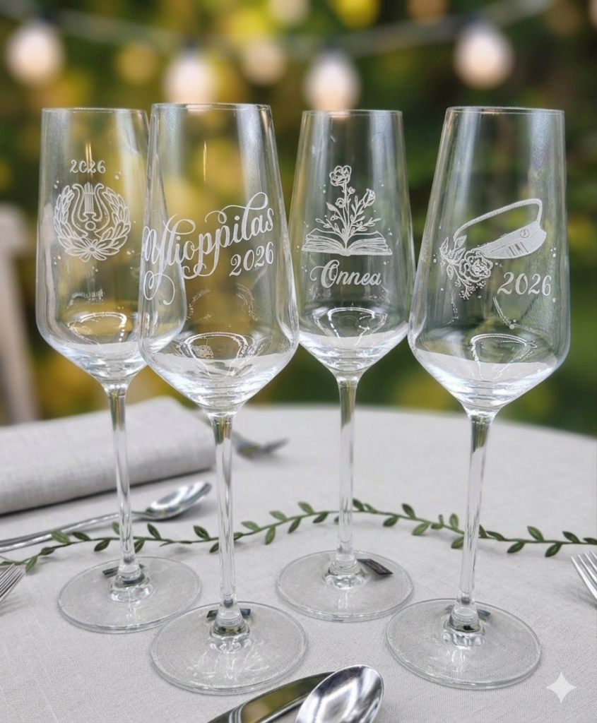 Uniikki kaiverrus lasiin, joko omaan esineeseesi tai minulla on monenlaisia laseja kotona. Jokaisen kaiverruksen teen yksi kerrallaan ensin käsin piirtäen ja sitten vapaalla kädellä kaivertaen.