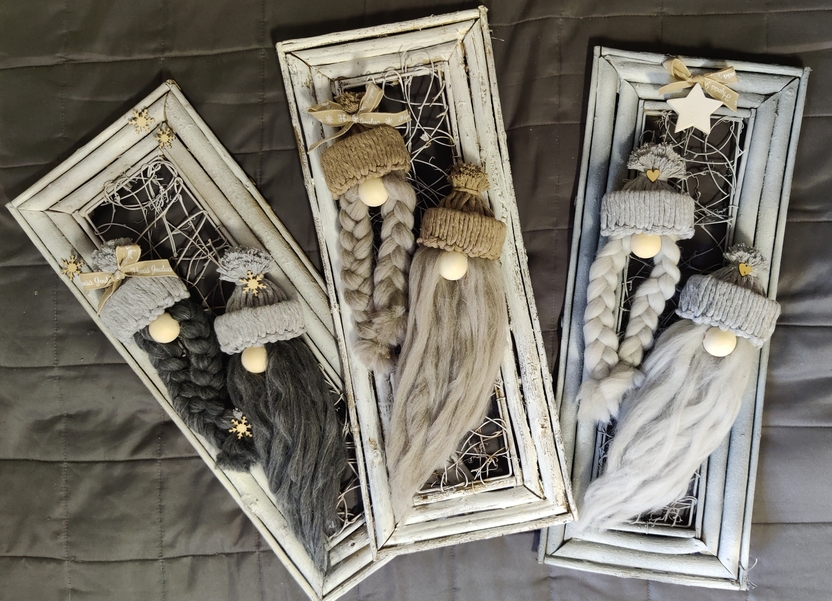 Joka jouluksi yritämme ideoida jotain uutta ja ihanaa. Ja aina on mukana myös suosikkeja edellisiltä vuosilta. Kojumme on täynnä erilaisia kransseja, valotauluja, lyhtyjä, enkeleitä, tonttuja ja monenmoisia käsitöitä. Käytämme paljon kierrätystavaraa käsitöissämme. Monet tuotteista on yksittäiskappaleita joten joskus tarvitsee olla nopea jos jonkin tietyn haluaa.