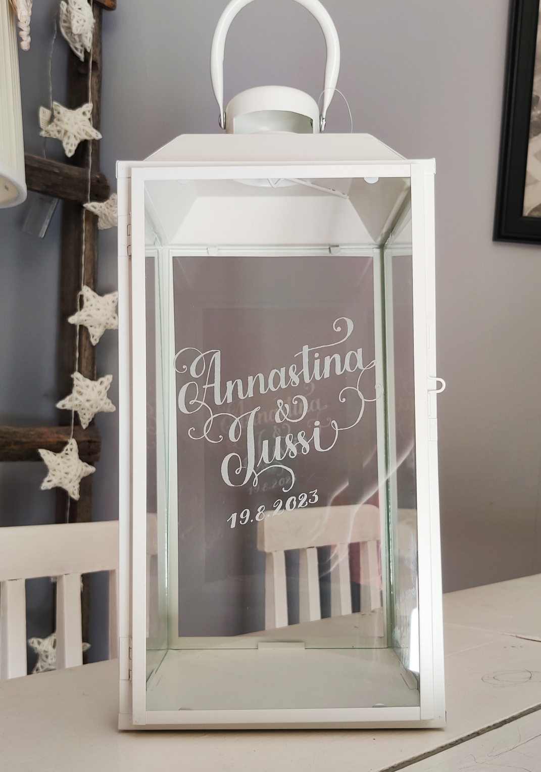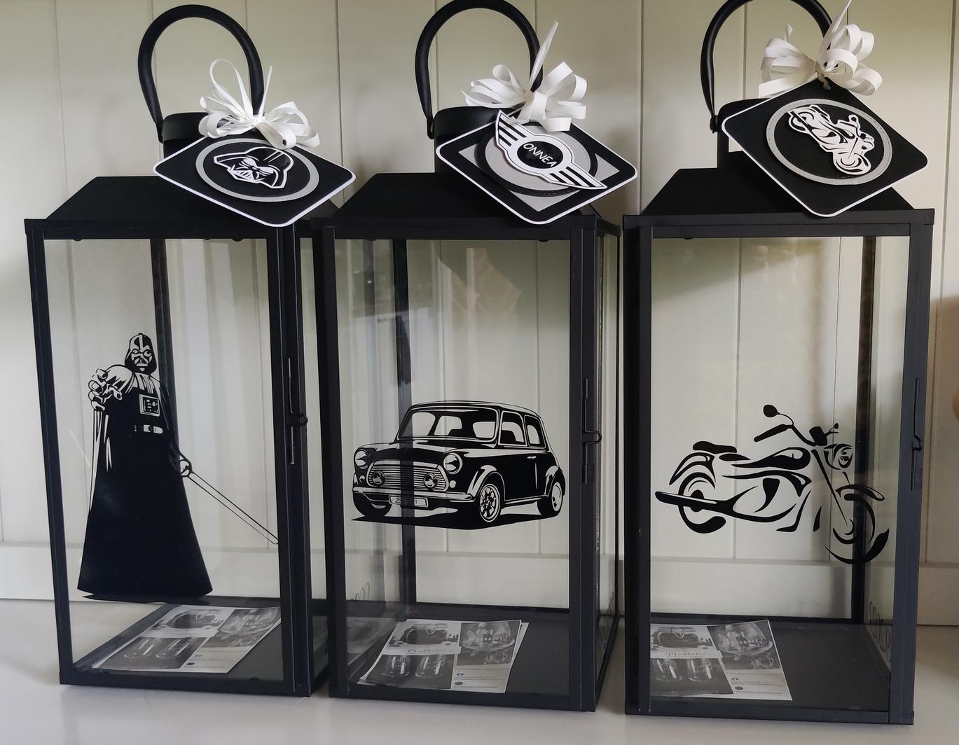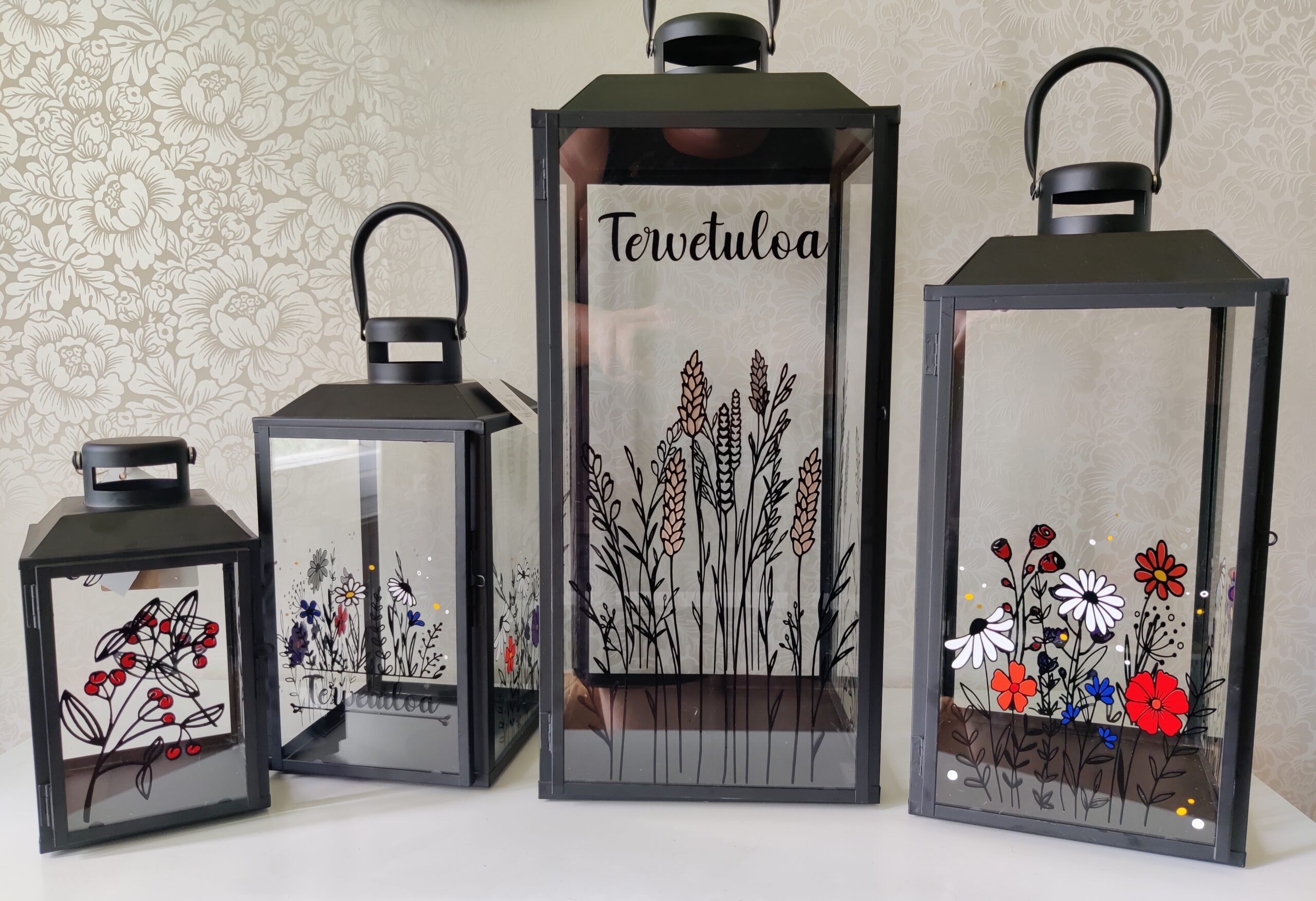 Tilauksesta onnistuu lyhtyihin erilaiset tekstit ja kuvat. Lyhtyjen kuviointeja en tee ihan samalla tavalla käsityönä kuin kaiverrukset, vaan nämä suunnittelen tietokoneella. Kaikki kuitenkin sommittelen ja suunnittelen yksi tuote kerrallaan joten kahta samanlaista ei ole.