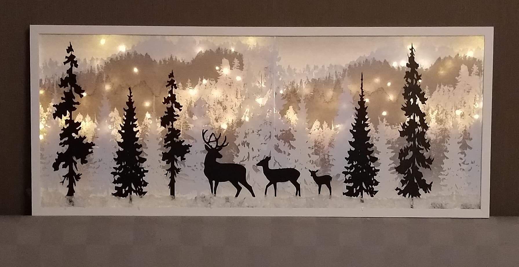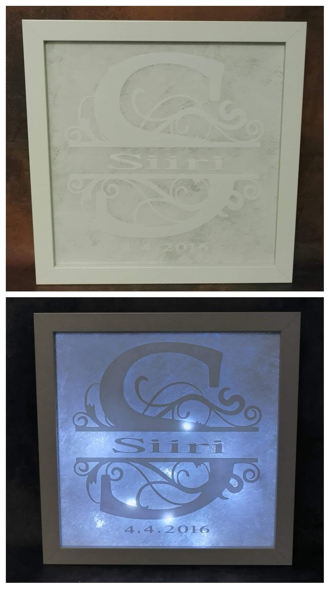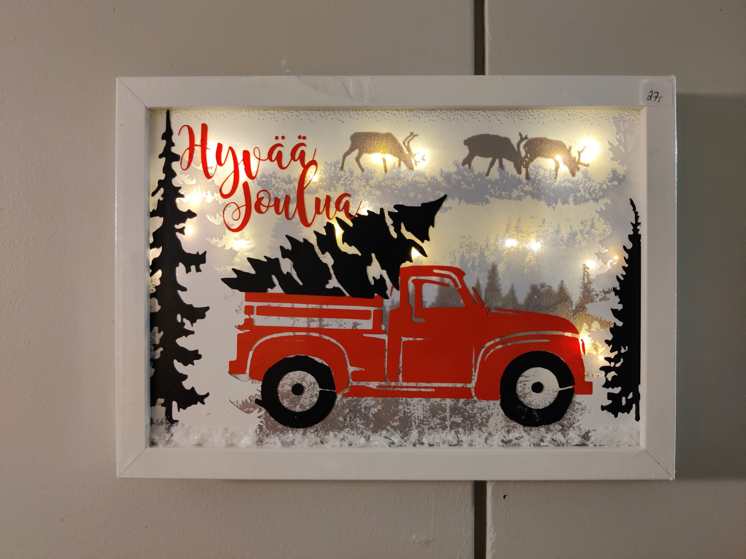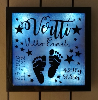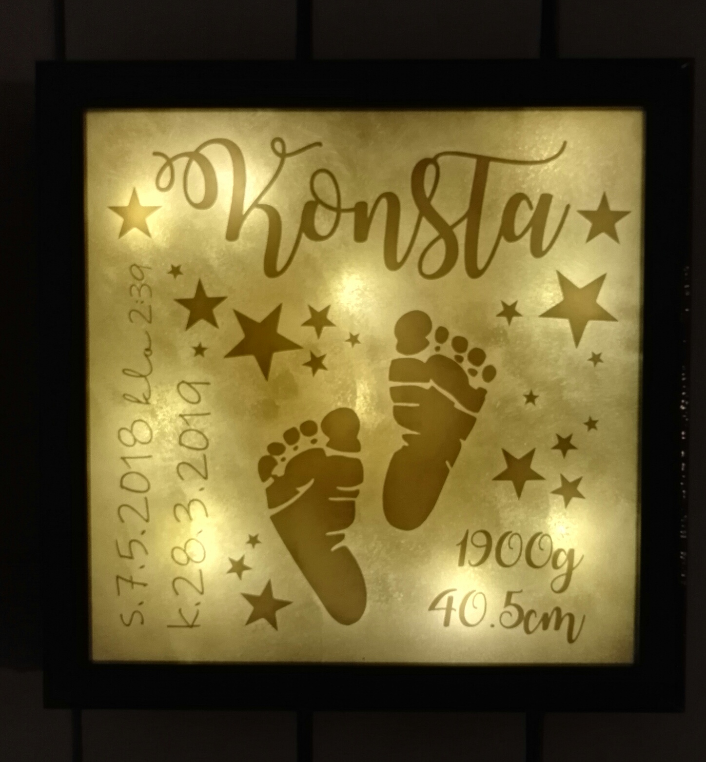 Kuva on pleksin/lasin pinnassa. Alareunaan voidaan laittaa myös ”lunta”. Kuvan alla on tapetti jonka läpi valo loistaa ja leviää kauniisti,