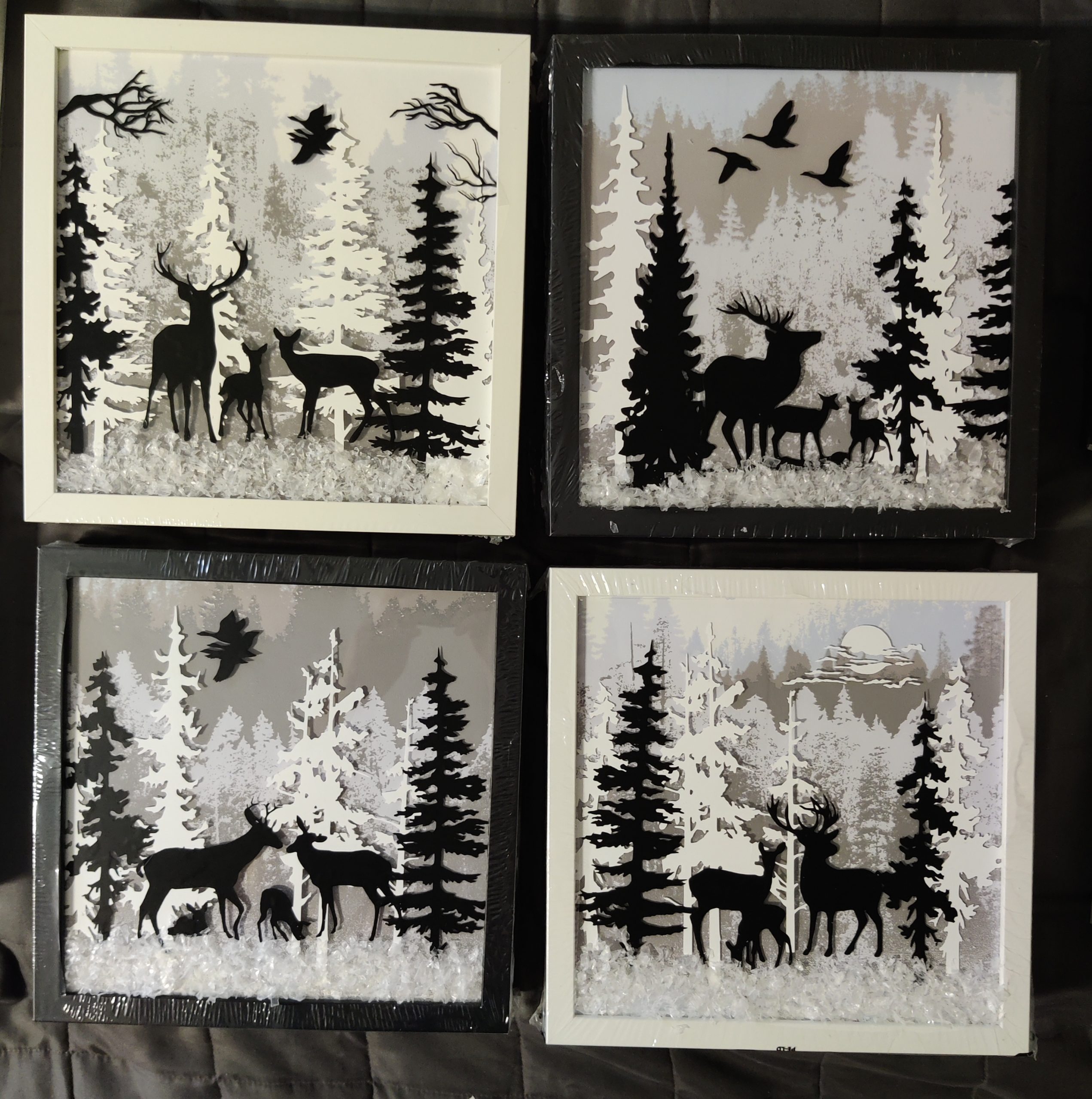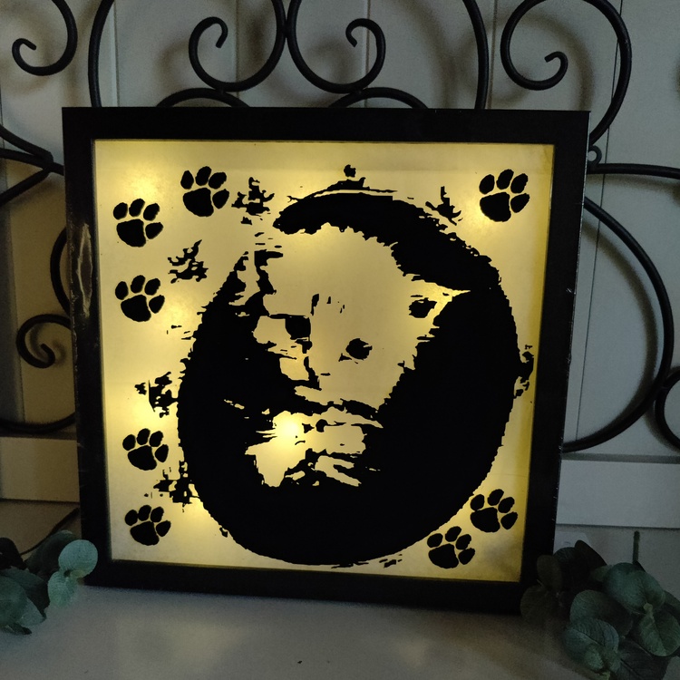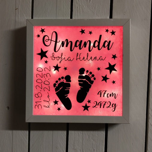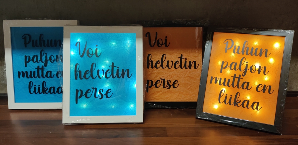 Kaikissa tauluissa on valmiiksi sisälleasennettuna, paristokäyttöinen, led-valonauha. Paristokotelo on kehyksen takana.