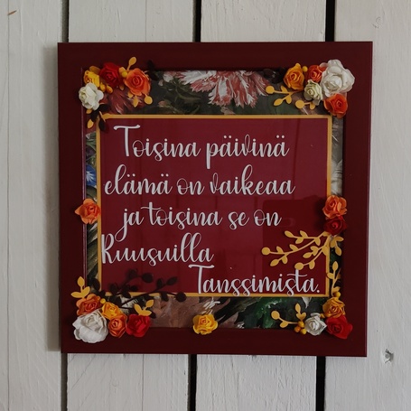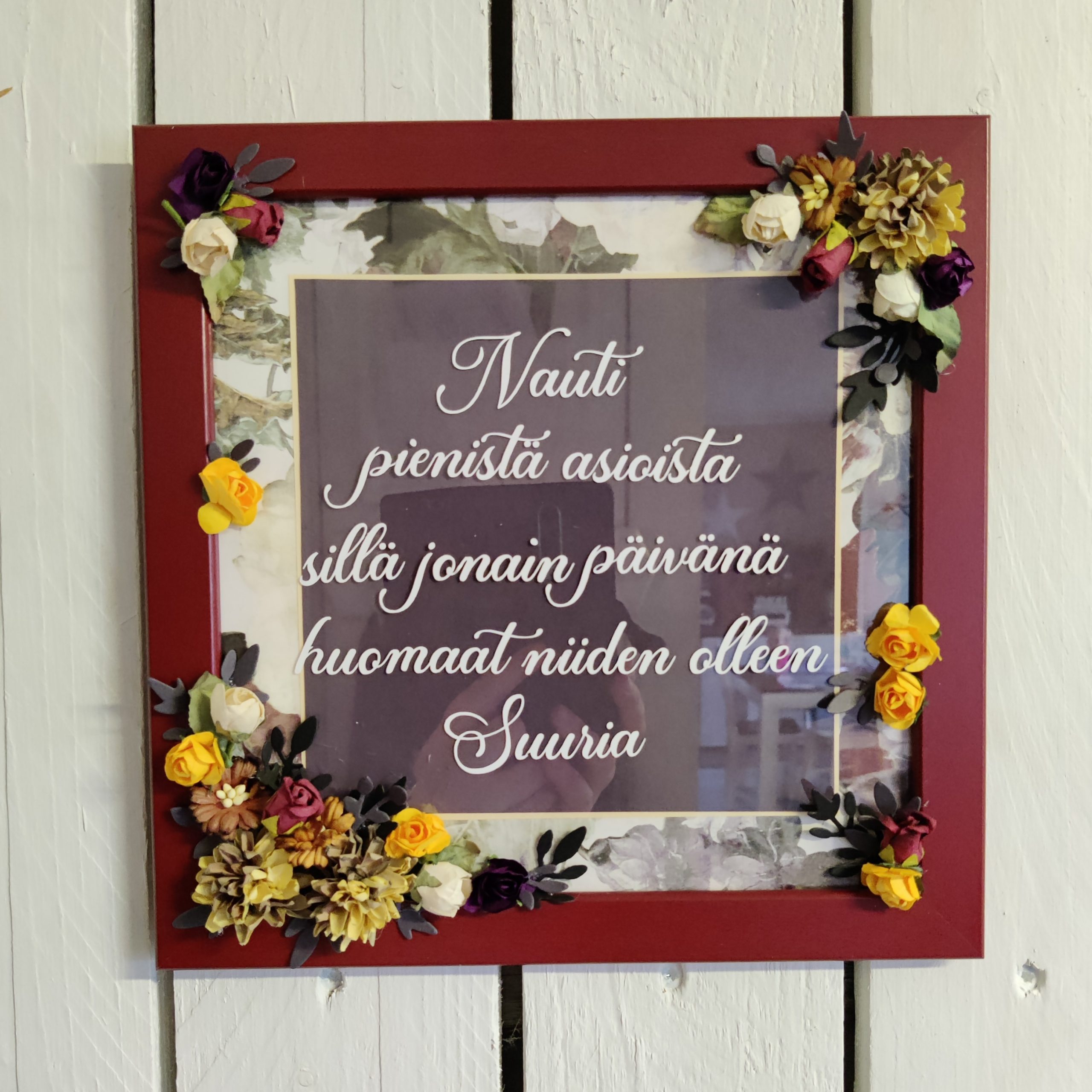 Tekstin alla on valkoinen ”utuiseksi” maalattu pinta jonka alta kuultaa kauniisti pohjaväriksi valittu väri. Tämä maalaus on mahdollista myös jättää pois. Värin tekee silkkipaperi joita onkin valittavana montaa väriä. Pohjaväriksi löytyy esimerkiksi vaaleanpunainen, pinkki, liila, turkoosi, sininen, vihreä, oranssi ja keltainen. Silkkipaperi on mahdollista myös vaihtaa itse, jos joskus niin haluaa.